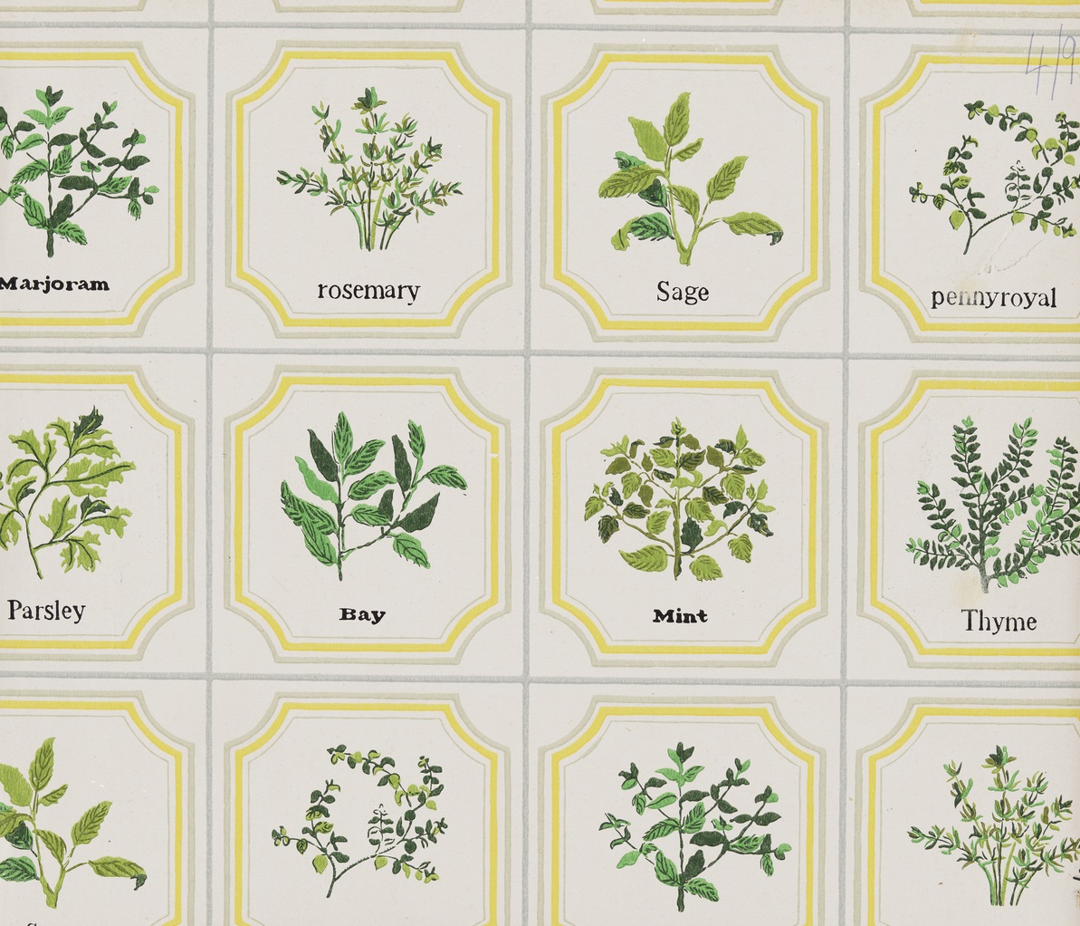 Portion of herb wallpaper from ‘Starred Ways’. Crown, 1965. Surface machine printed embossed wallpaper.