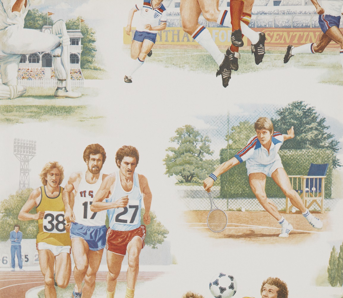 Portion of sports wallpaper. Crown, c.1980-89. Machine printed wallpaper.