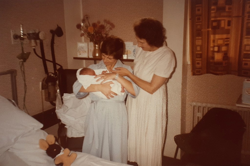 This photo struck me as very of its time as there were orange/brown fabric curtains hanging up at the hospital. This must have been Leighton hospital in Crewe – and my elder brother’s birth.