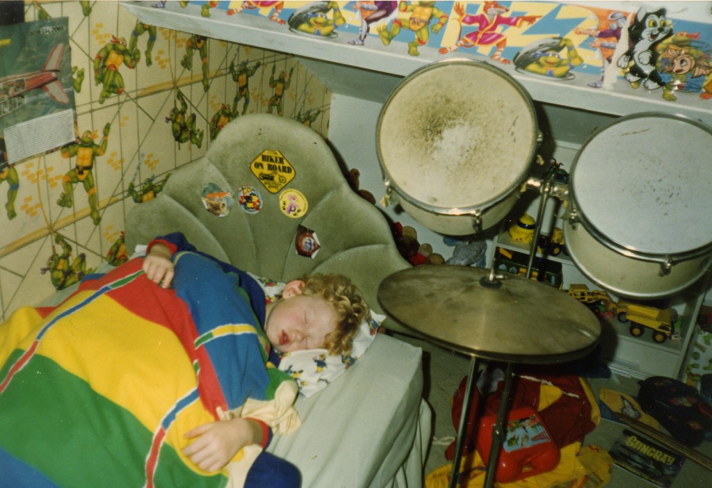I can remember it was just after my sister was born, so they had to convert the attic into my bedroom for space. I was absolutely obsessed with Teenage Mutant Ninja Turtles when I was a kid, I had all the figures and everything and I imagine my dad took this as a funny picture, as if he’s about to start drumming while I’m asleep at night [laughs]. So they had to put the drums upstairs because it was too loud for my mum downstairs so, yeah… I imagine my dad was just taking the mick [laughs].